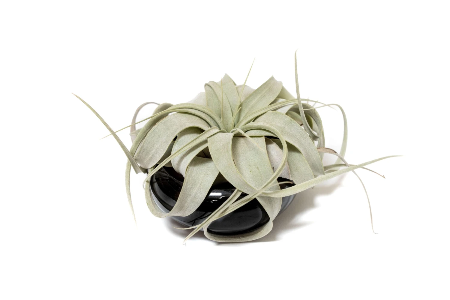 Our Seedling Xerographica looks adorable in our small black dish holders. The small, curly, silver leaves contrast beautifully with the holder. Great gift idea or friend in the office. The black dishes are made of high quality, kiln-fired, terracotta and are dipped in a rich black glaze. The Xerographica adds about two inches to the height of the design.