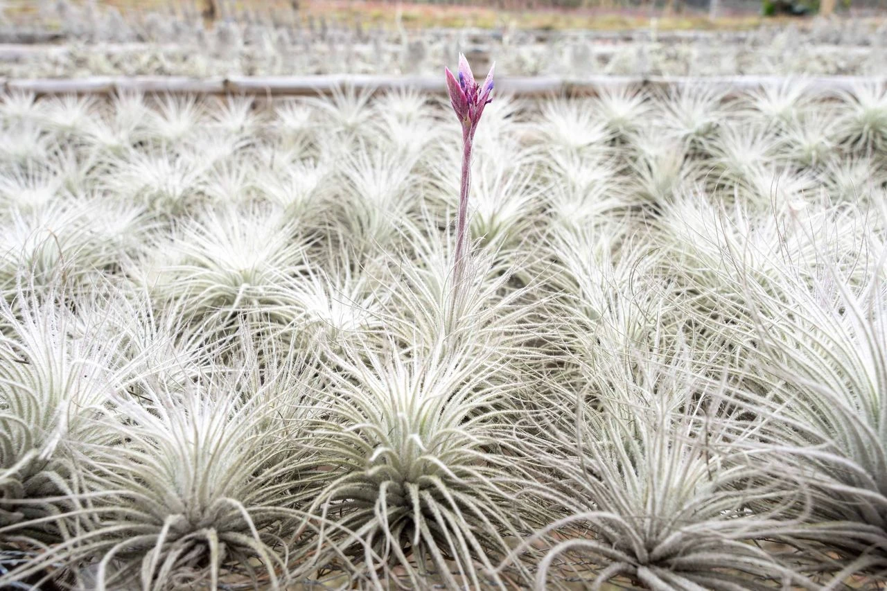 One of the most sought-after tillandsia that we have! An adorable easy-care plant. The trichomes create a bright white appearance. The inflorescence (spike) is purple with lavender blooms.