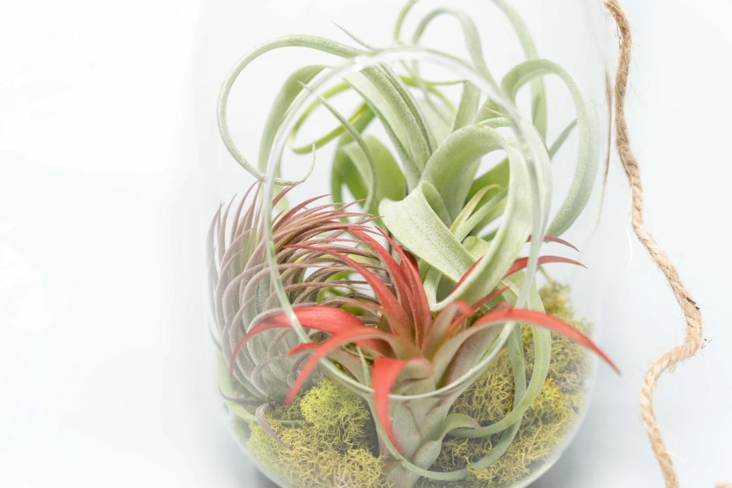 Our glass capsule terrarium is the perfect modern air plant display. With its unique tall shape, it is sure to be eye catching. Hang this terrarium from its loop or set on any flat surface. This kit comes complete with three assorted tillandsia, moss and hemp string for hanging.Â