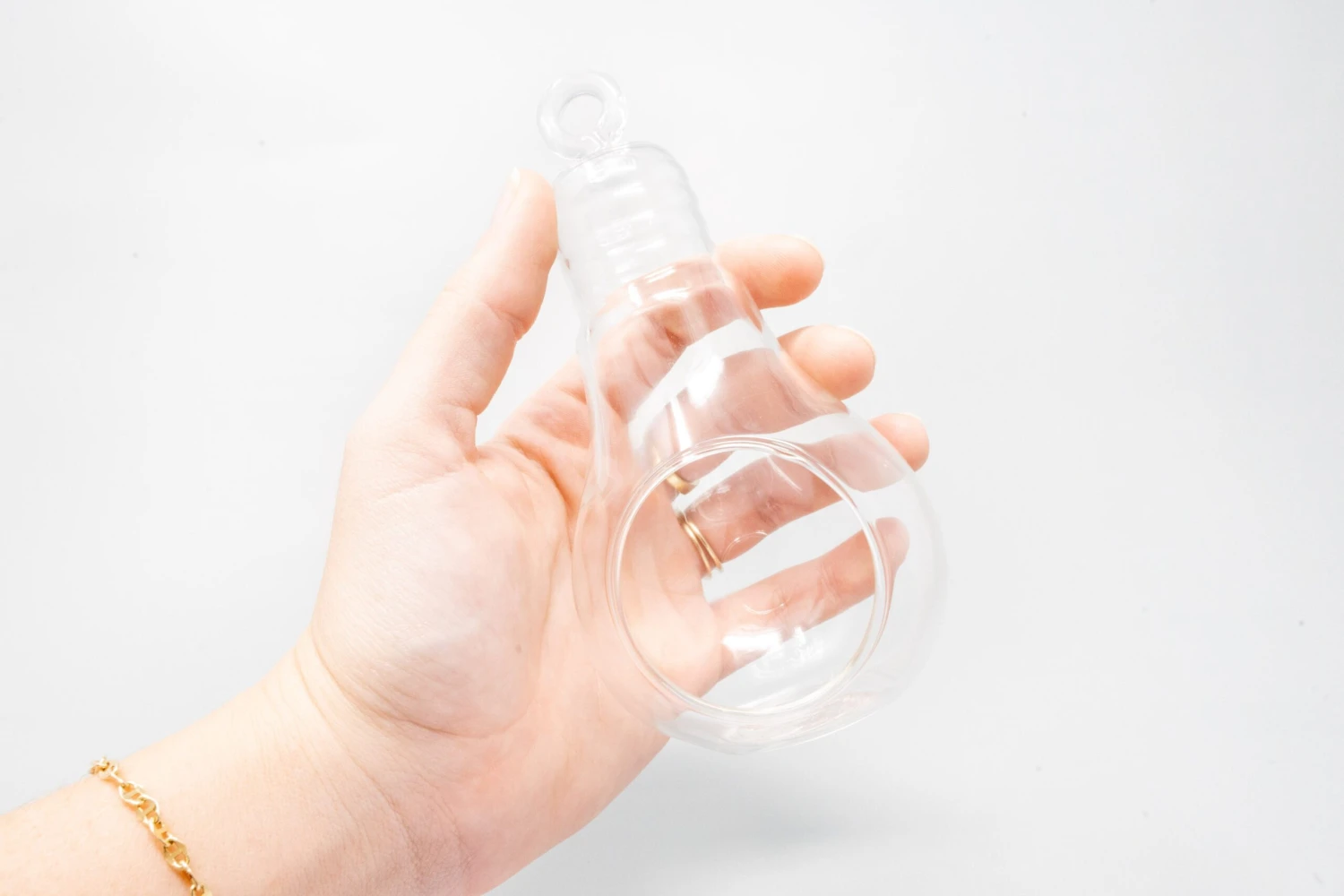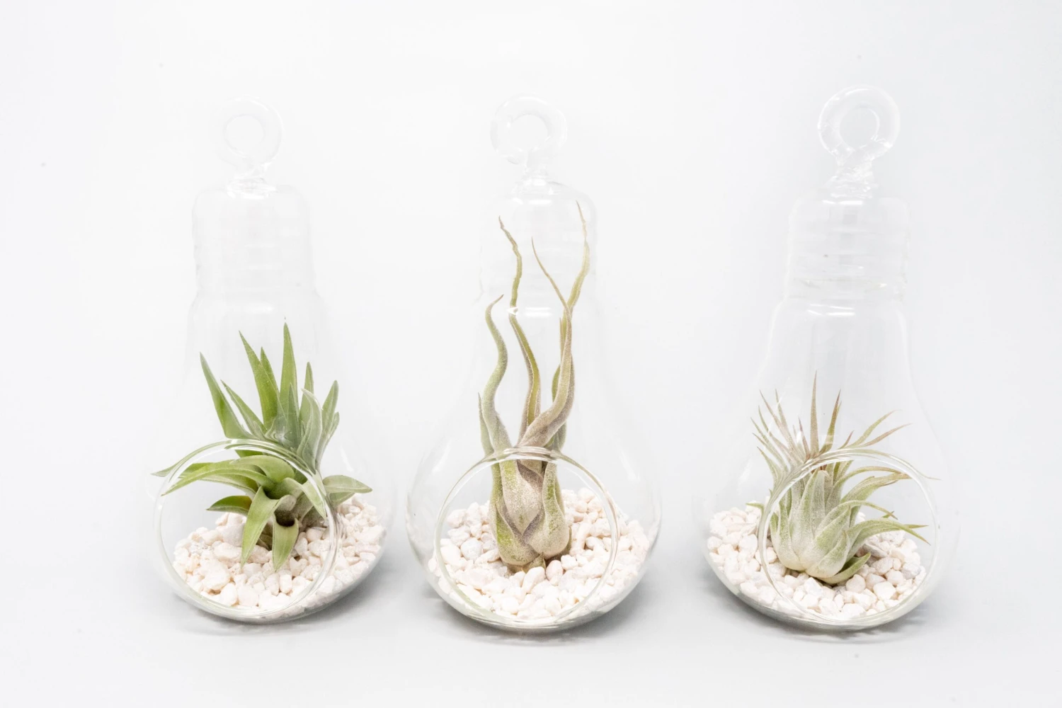 Our light bulb shaped glass terrariums are sure to turn heads. These adorable kits come with crushed white stone, an assorted tillandsia air plant and terrarium. They are sure to brighten up any space. They have a hook for hanging or you can place them on their flat bottom.Â