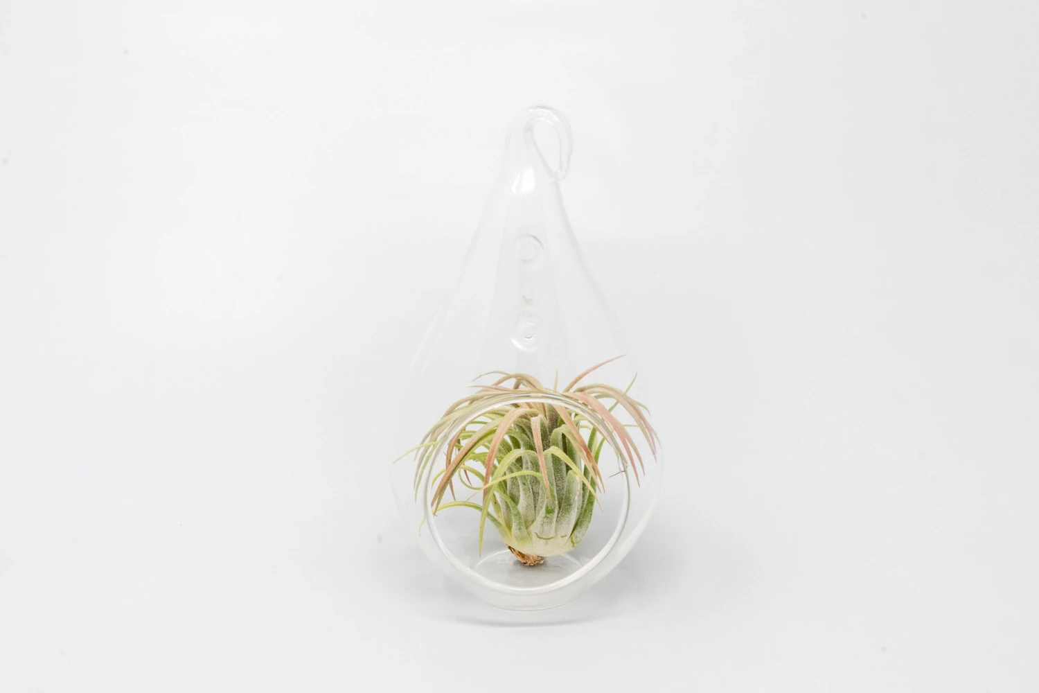 A simple teardrop terrarium with your choice of air plant. Admire the plant’s unique form from all angles of the glass. No dirt required. They have a hook for hanging or you can place them on their flat bottom.