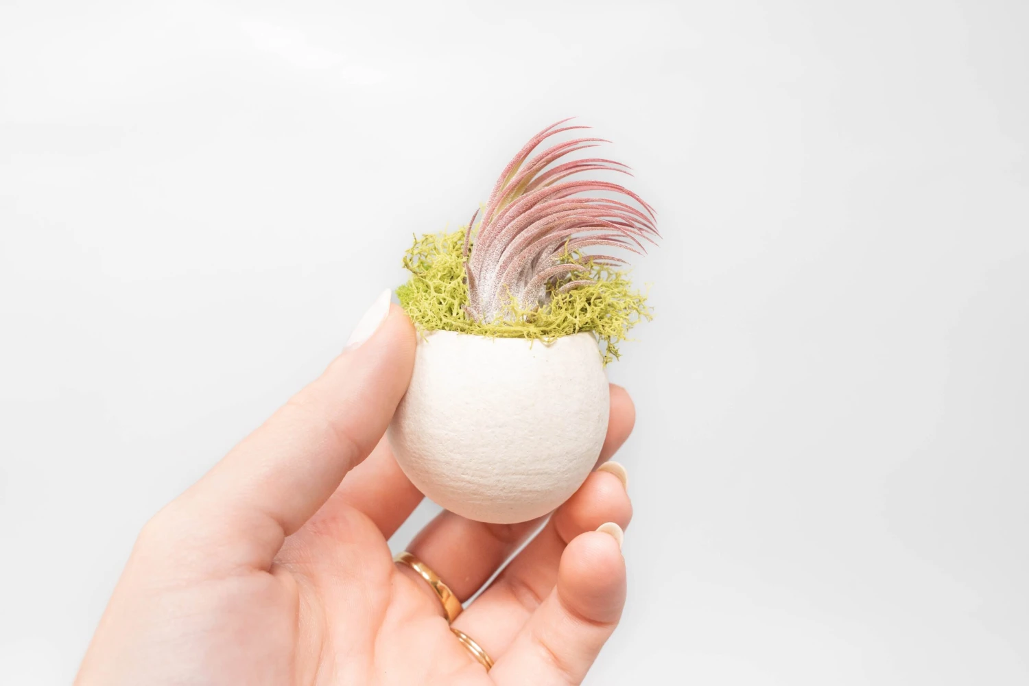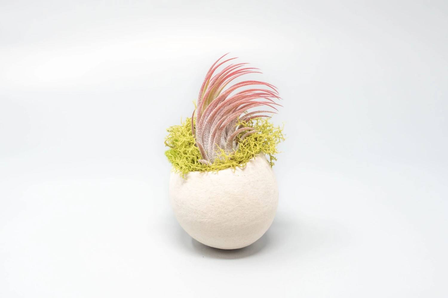 Statement pieces can come in small packages! Enjoy your new adorable Ionantha air plant held in a beige-colored seed pod. A pinch of preserved chartreuse reindeer moss is included. Opening up this gorgeous air plant will brighten anyone’s day. This easy-to-care-for arrangement is perfect for offices, kitchens, side tables, or party decor.