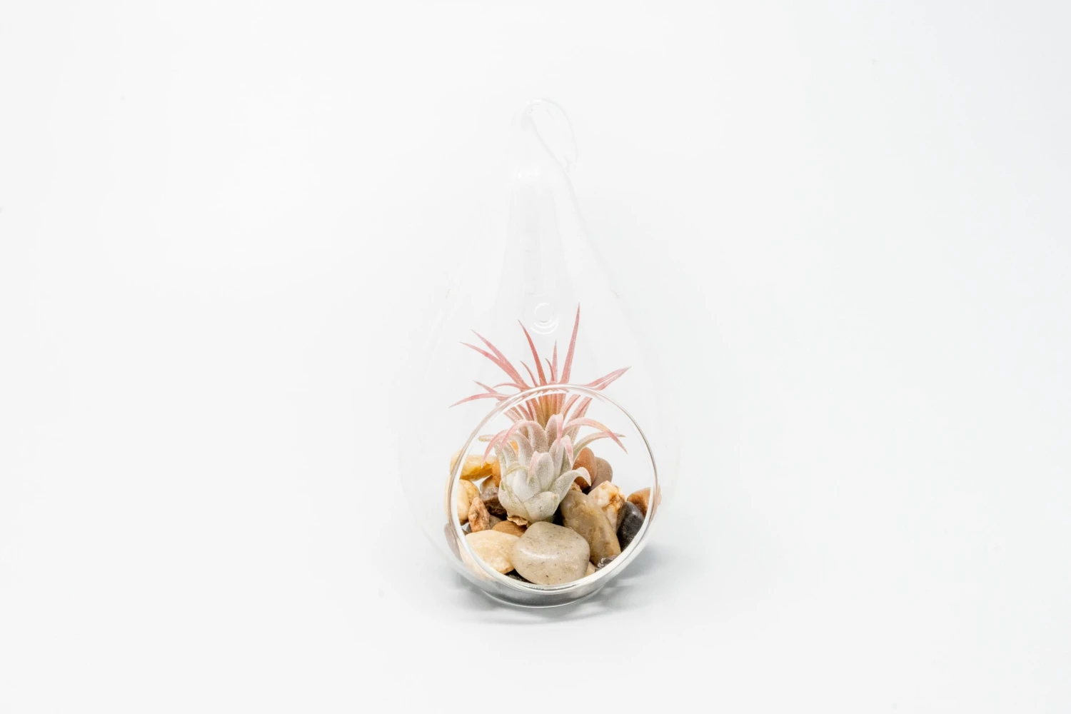 Showcase exotic Argentea Thin (Right), Abdita (Middle), and Ionantha Guatemala (Left) air plants in hand-blown glass teardrop-shaped terrariums complete with smooth river stones. Artistically hung in groups of three, or placed on a table with their flat bottoms, these arrangements will add a gorgeous touch of nature to the indoors.Â