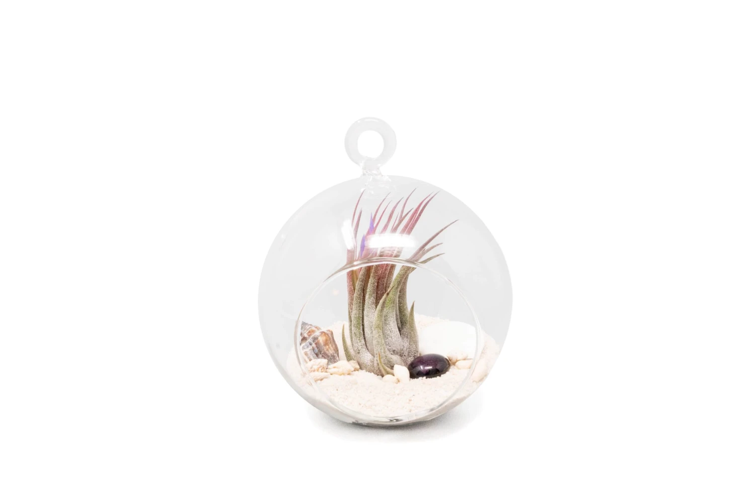 These cute beach terrariums in teardrop glass are wonderful gifts, favors, or decorations. The kits include white sand, various sea life, glass bead, and ionantha. Just pour the sand in and place the starfish, seashell, and air plant inside. It is that easy!